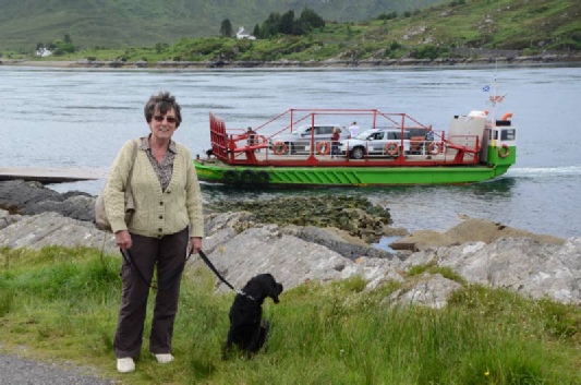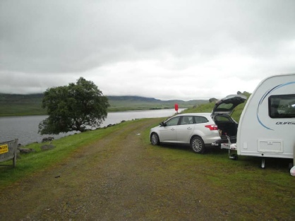 We had a good journey arriving in Saffin on the north coast of Skye for lunch. After lunch we took the moorland road to Uig where we realised there was a campsite. Not only was this far more convenient for the ferry in the morning but it would also avoid having to tow early morning along what could be mist covered narrow roads. Back at the site we negotiated a refund booked in at Uig and travelled there via Portree to avoid the coast road enveloped in mist. It was a very convenient park with the added bonus of a large grass area attached to walk Max.
